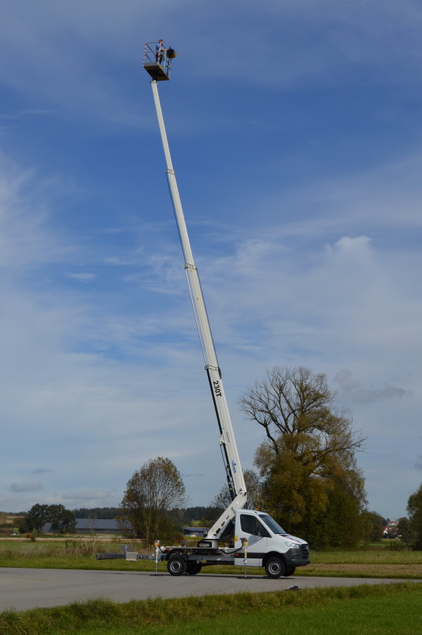 Der GSR B230T Comfort X auf MB Sprinter bietet eine Korblast von 250 kg und erreicht eine maximale Arbeitshöhe von 22,30m, sowie eine maximale seitliche Reichweite von ca. 14,00 m. In dieser Bühnenkategorie außergewöhnliche Leistungsdaten. Vorne und hinten kommen ausfahrbare H-Stützen zum Einsatz. Das Gerät verfügt über eine dynamische Drehzahlregelung, welche die Betriebsgeschwindigkeit erhöht.