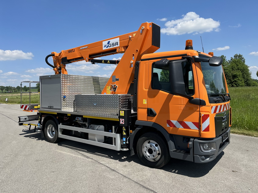 The telescope truck platform E180TJ with 18,20m working height can be displayed on a 7.5 ton chassis. A wide range of accessories is available, some of which are already included in the standard equipment of the device.