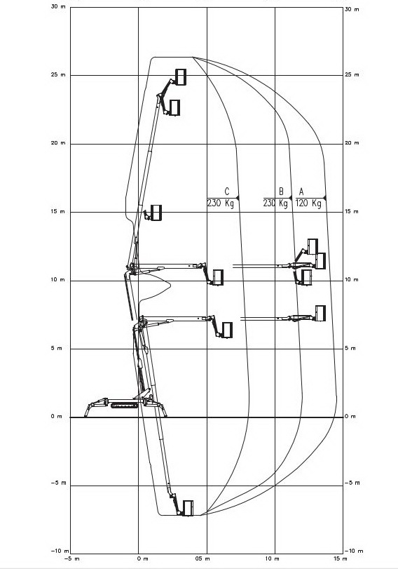 Die maximale seitliche Reichweite beträgt 14,50m bei 120kg. Die maximale Korblast liegt bei 230kg. Optional bei maximal 300kg. Die minimale Durchfahrtbreite liegt bei nur 0,89m (ohne Korb), die Durchfahrthöhe bei 1,99m.